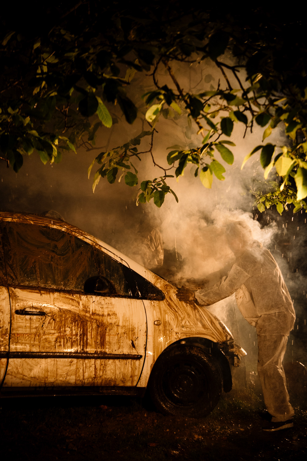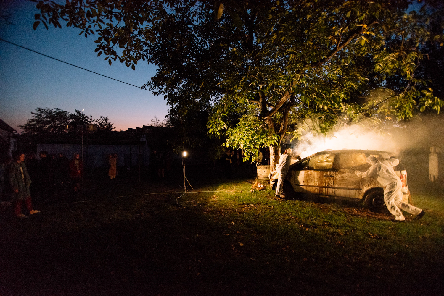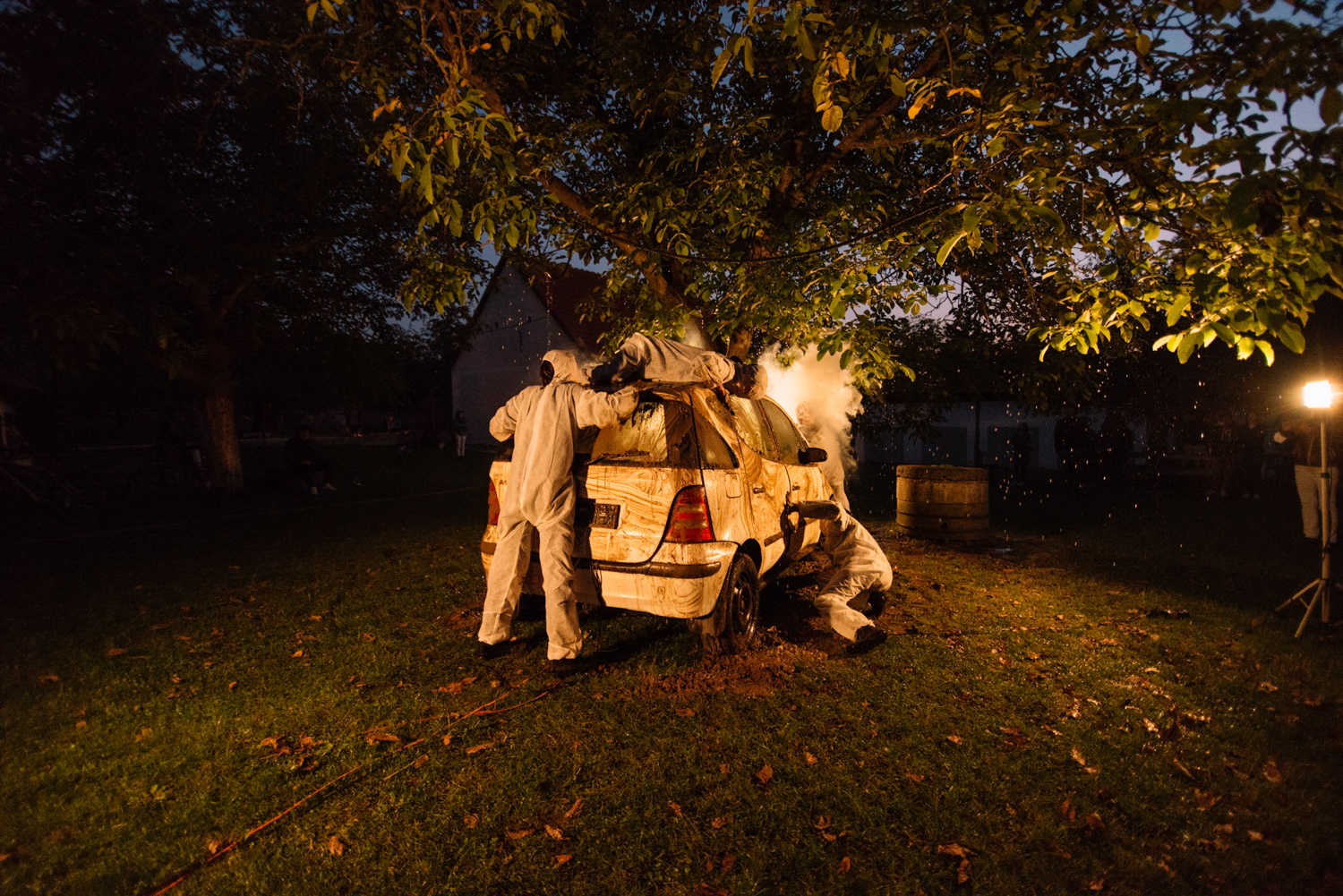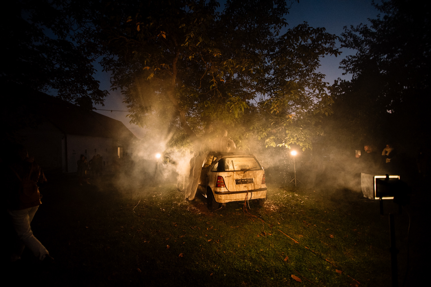 Dielo pozostávalo z inštalácie nabúraného auta do stromu, pripomínajúcej filmový set, či miesto činu, krátkej textovej pasáže hrajúcej z reproduktoru ukrytého v strome, repetitívnej performance a hudobného doprovodu. Performerky a performeri v kostýmoch zámerne pomalými pohybom obaľovali auto hlinou, občas až eroticky, napodobujúc a obracajúc sexistické videoklipy so ženami umývajúcimi autá a symbolicky tak urýchľovali jeho rozklad. Dielo otváralo existenčné otázky o smrti jednotlivca a skrz ne aj otázky smrti iných živých organizmov (stromu) a načrtávalo tak možnosť menej antropocentrického a ekologickejšieho pohľadu na svet.