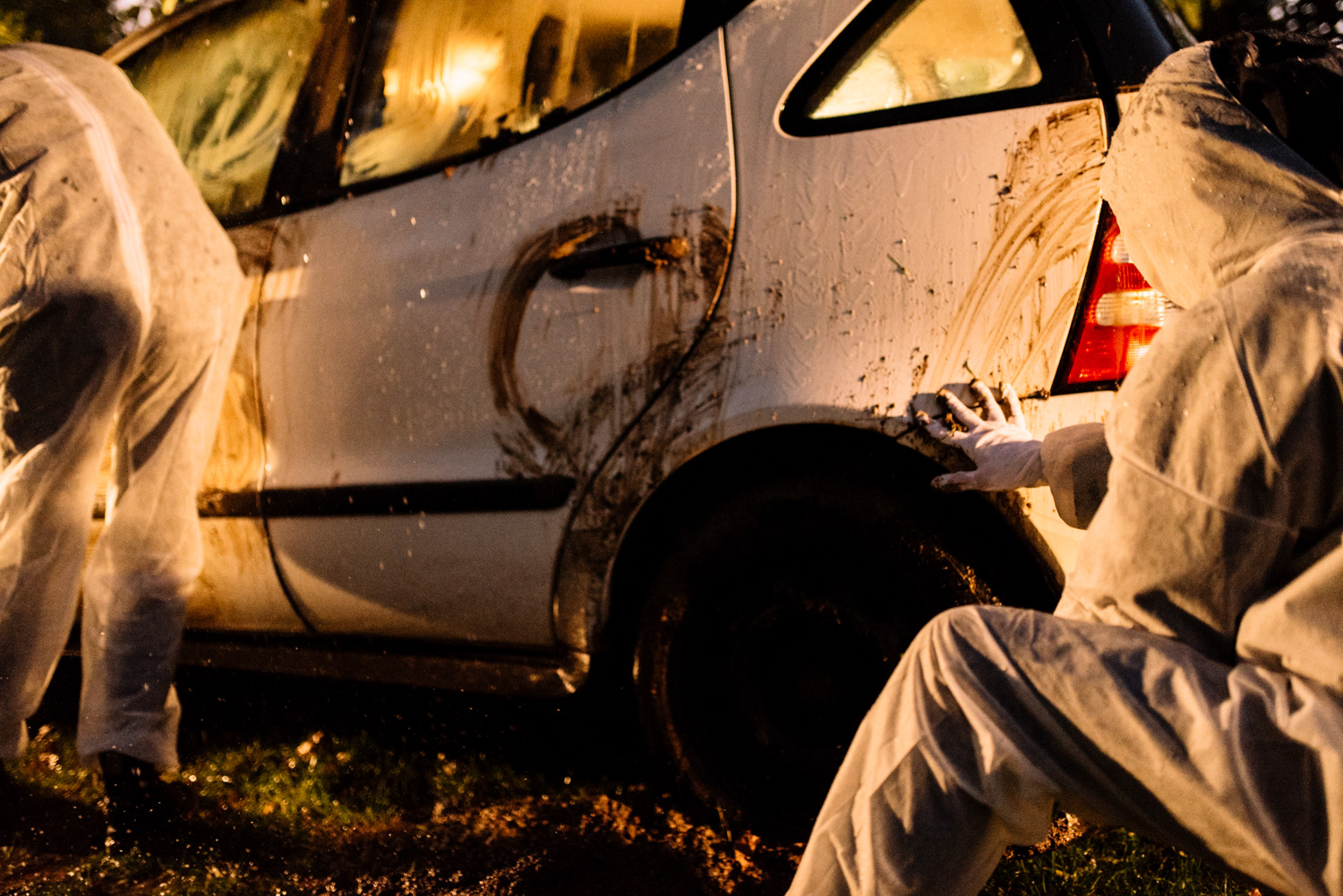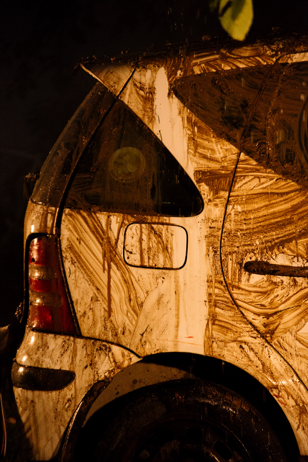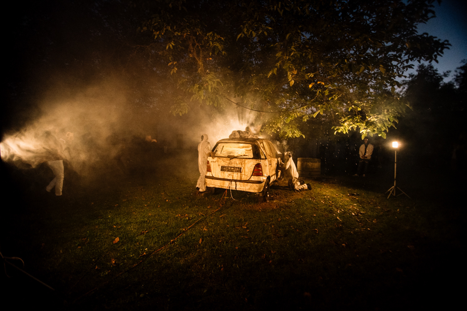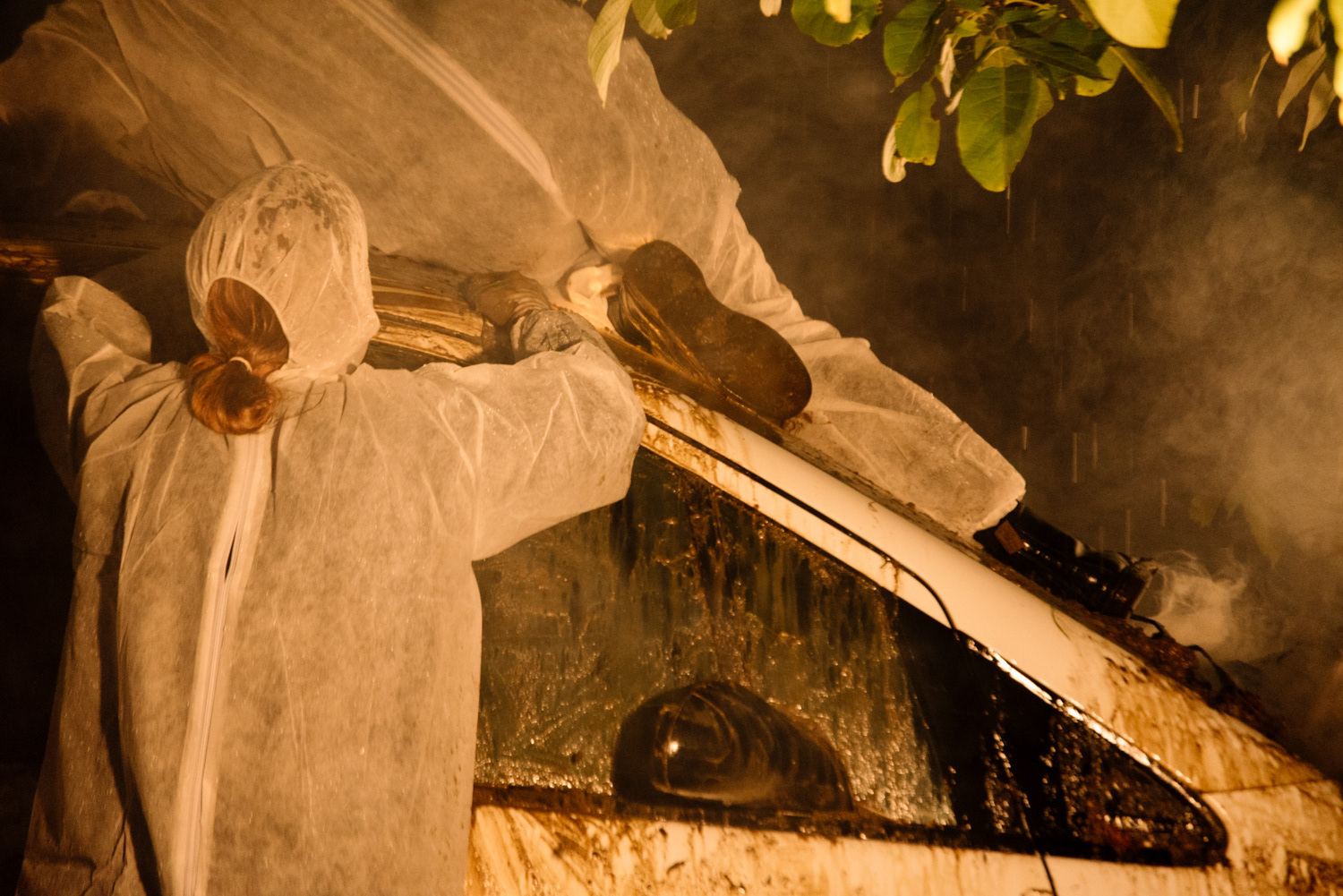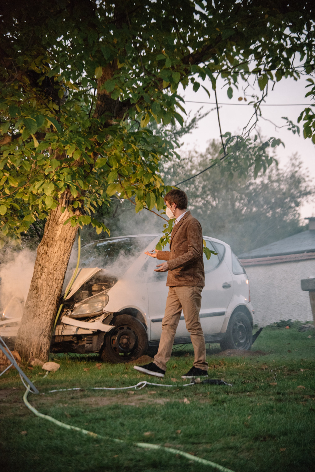 Dielo pozostávalo z inštalácie nabúraného auta do stromu, pripomínajúcej filmový set, či miesto činu, krátkej textovej pasáže hrajúcej z reproduktoru ukrytého v strome, repetitívnej performance a hudobného doprovodu. Performerky a performeri v kostýmoch zámerne pomalými pohybom obaľovali auto hlinou, občas až eroticky, napodobujúc a obracajúc sexistické videoklipy so ženami umývajúcimi autá a symbolicky tak urýchľovali jeho rozklad. Dielo otváralo existenčné otázky o smrti jednotlivca a skrz ne aj otázky smrti iných živých organizmov (stromu) a načrtávalo tak možnosť menej antropocentrického a ekologickejšieho pohľadu na svet.