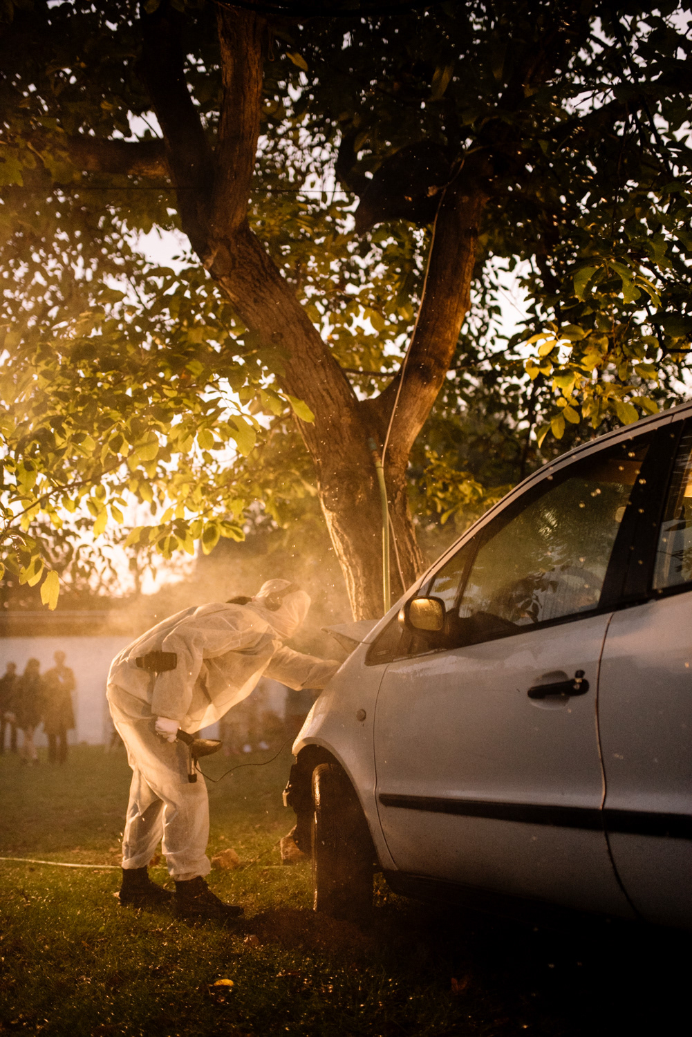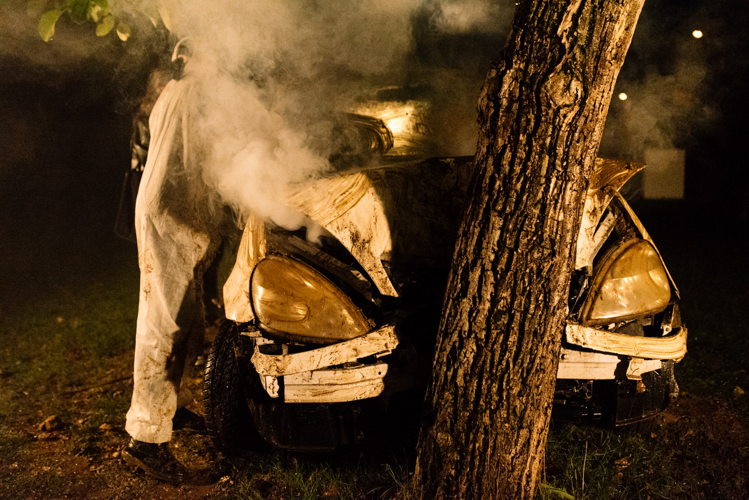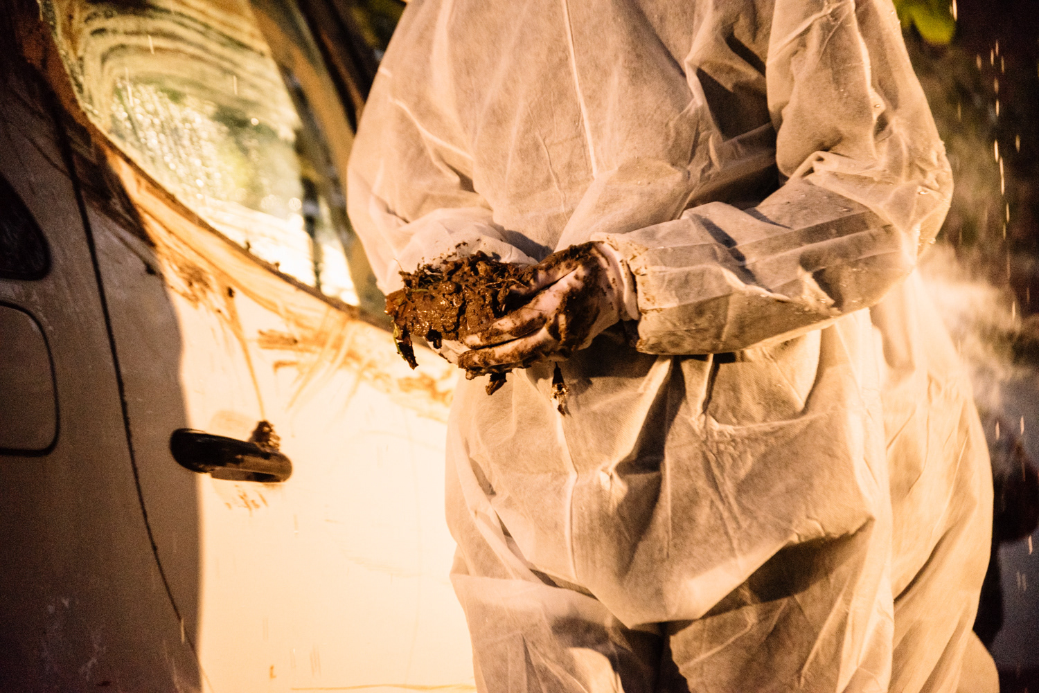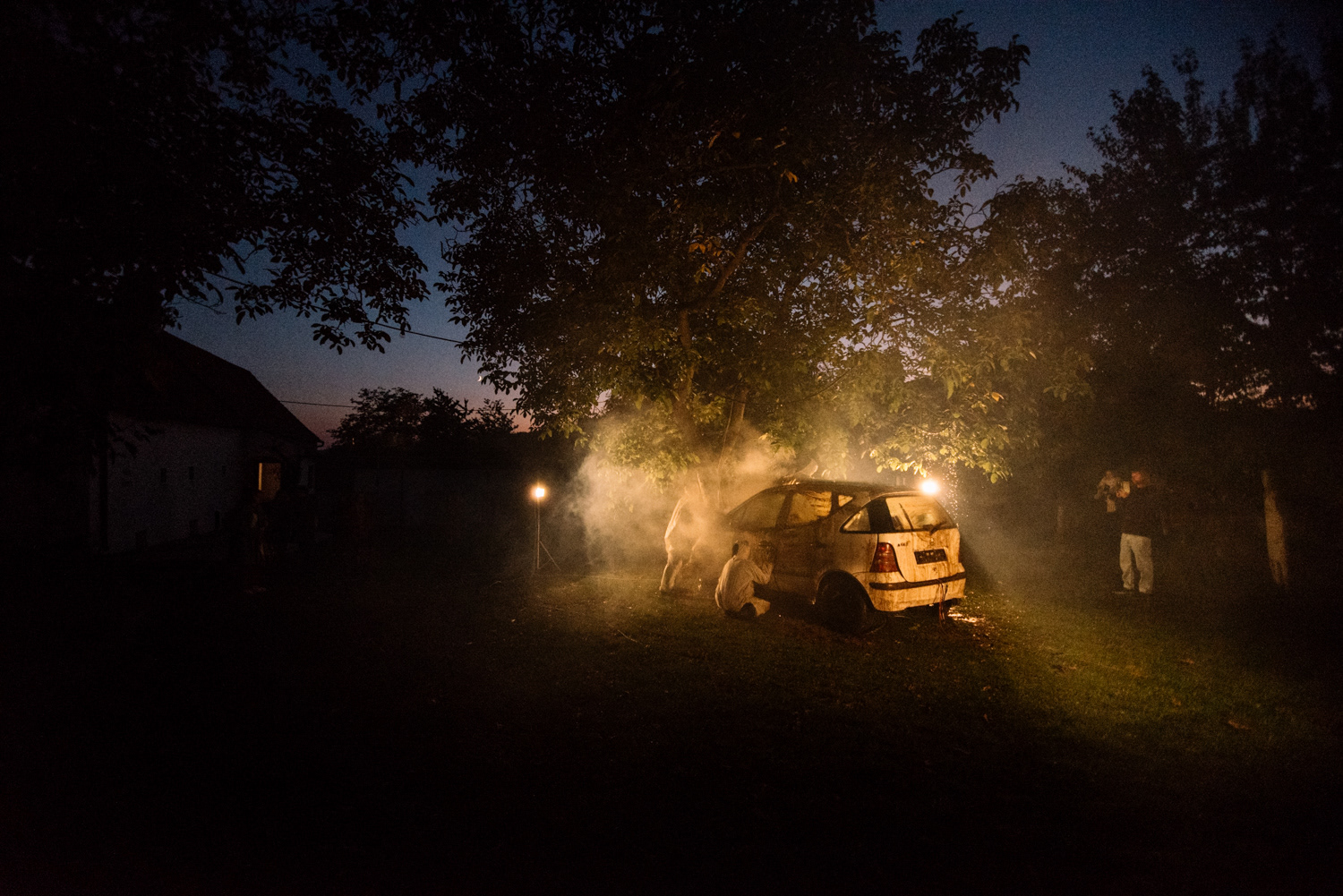 Dielo pozostávalo z inštalácie nabúraného auta do stromu, pripomínajúcej filmový set, či miesto činu, krátkej textovej pasáže hrajúcej z reproduktoru ukrytého v strome, repetitívnej performance a hudobného doprovodu. Performerky a performeri v kostýmoch zámerne pomalými pohybom obaľovali auto hlinou, občas až eroticky, napodobujúc a obracajúc sexistické videoklipy so ženami umývajúcimi autá a symbolicky tak urýchľovali jeho rozklad. Dielo otváralo existenčné otázky o smrti jednotlivca a skrz ne aj otázky smrti iných živých organizmov (stromu) a načrtávalo tak možnosť menej antropocentrického a ekologickejšieho pohľadu na svet.